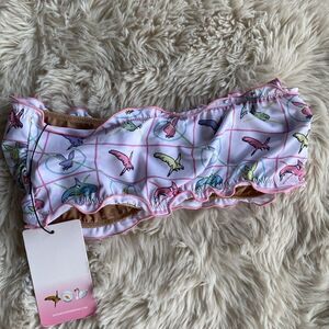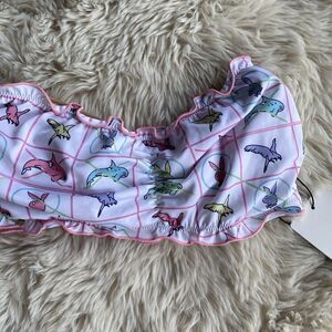 Details: strapless bandeau silhouette, ruching and detailed with pastel characters across the body - while frilled edges add a playful edge to this summer staple.