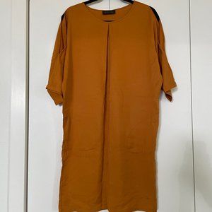 A golden ochre shift dress with dolman sleeve, knee-length silhouette in tencel twill. Details include a scooped neckline with binding and center front pleat, half-length sleeves with a skin-revealing slit and side seam pockets with topstitching.
