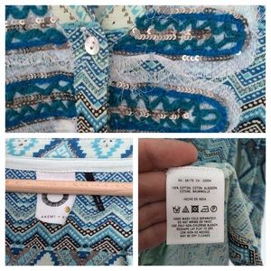 EUC. Pullover styling. 3/4 sleeves. Cotton. Hand wash. 26.75" L. By Akemi + Kin. Front detail has fraying because of the nature of the fabric. Top was dry cleaned recently. 🚫Trades/PayPal/Modeling🚫