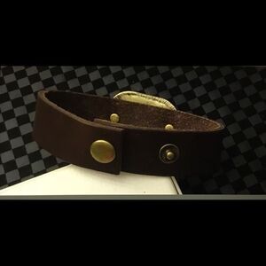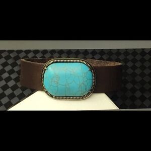 This trendy bracelet features a large octagonal shaped genuine turquoise gemstone which has a silver rope style frame and sits in a genuine brown leather strap band. The stone measures 1.5” x 1.25”. The strap is 3/4” in width and has two adjustable snap closures. It will fit a 7” to 8.5” wrist size.