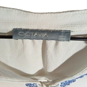 This top from Octavia is a peasant style top with beautiful blue embroidery down along the collar line to come to a peasant style tie. It has elastic cinched sleeves and is a flowy top. Hand wash only. No visible flaws.