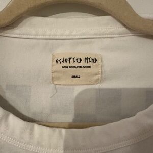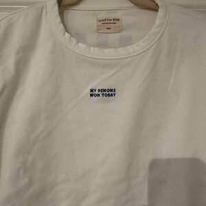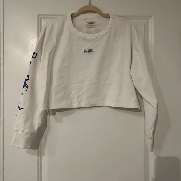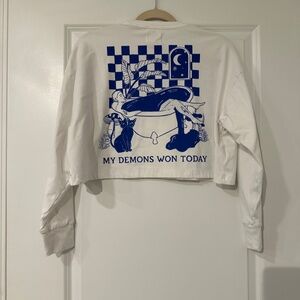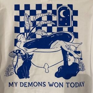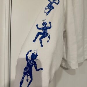 Creamy white tone with cobalt blue logo on the front and large cobalt blue design on the back!