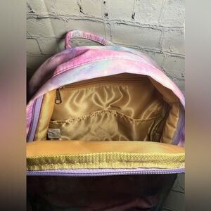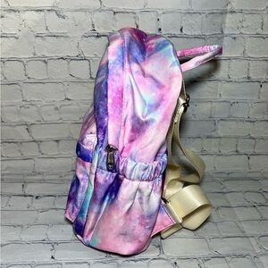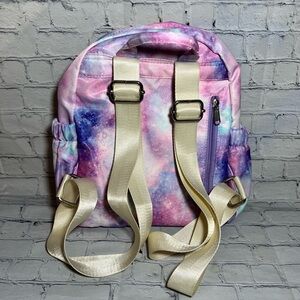Small backpack has a main zip compartment with 3 slip pockets and one zipper pocket. Exterior has 2 side pockets and one front zip pocket. The back has one zip pocket perfect for hiding valuables.