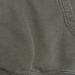 Faded. Visible wear. Distressed. Holes around cuffs, pouch.