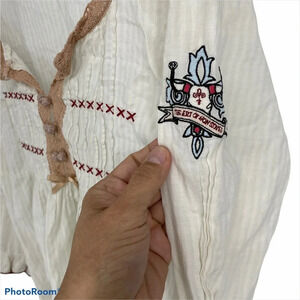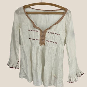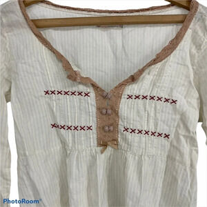 Cute little nautical like top. It is super soft with 3/4 sleeves. Side zip. The front of the shirt has some picks from a belt. See last photo. Priced accordingly