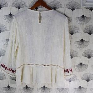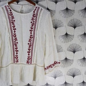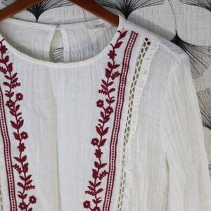 Oddi Longsleeve Boho Top, Off-white linen tunic shirt with embroidered burgundy floral details, Semi light and see through fabric, one button closure in the back, small ruffle hems