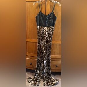 This jumpsuit has a faux leather upper, adjustable spaghetti straps, very stretchy, smocking at the upper back, very soft and silky material used at the legs. Extremely comfortable and moves with your body! Beautiful piece!!!! LOVE ♥️♥️♥️