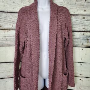Cozy Oddi popcorn textured cardigan sweater in mauve. Features open front design, longline length, and two front pockets. Women’s size Small/Medium. Soft and warm, perfect for layering.