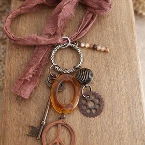 Embrace a bohemian vibe with this multi-color pendant necklace. Featuring a mix of brown, gold, and silver tones, this piece adds a unique touch to any outfit. One of a kind charms on a hand dyed silk sari ribbon