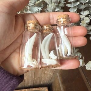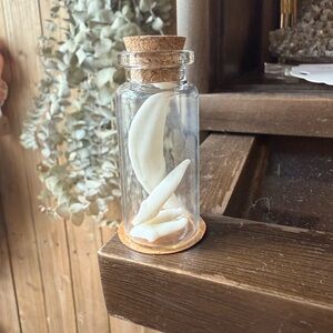 ODDITY BOTTLE - glass bottle featuring three different coyote teeth. Cork stopper included. Cute addition to any curio cabinet.