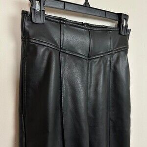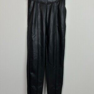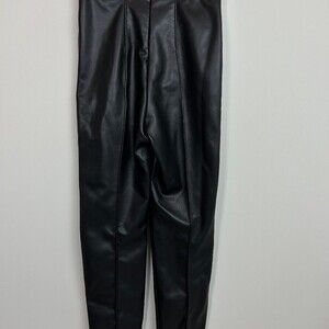 These faux leather pants are perfectly on trend and made by a London brand who creates investment pieces for your forever wardrobe. Great preowned condition- a slight imperfection (pictured) where the zipper stops on the back, but overall these look excellent! High rise with a v seam to accentuate the waist, pockets (!!), and seams down the front and back.