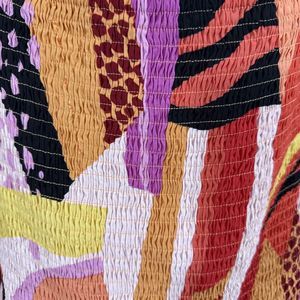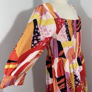 The Oddy Midi Dress in size 3XL is a vibrant and stylish choice for various occasions such as travel, weddings, parties, and more. This fit & flare dress features a square neckline, 3/4 balloon sleeves, and a beautiful smocked design. The dress is made from a comfortable knit fabric blend of nylon and rayon, with a multicolor geometric pattern accented by a bow detail. Perfect for curvy women, the dress exudes a bohemian, beachy vibe, making it a great option for vacations or casual outings.