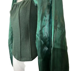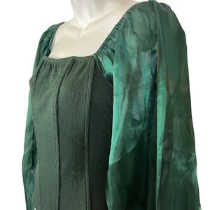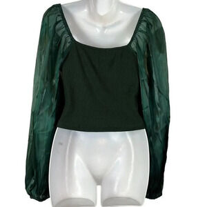 Oddy Womens Sheer Puff Sleeve Boned Ribbed Green Top Shirt Blouse NWT sz Large