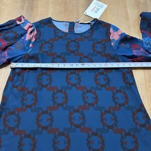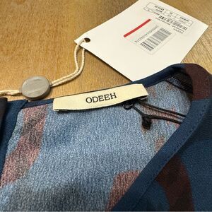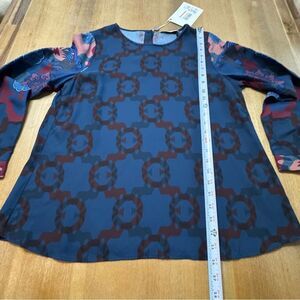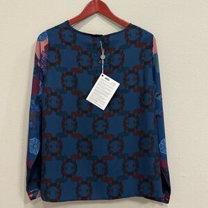 New with tags. ODEEH women’s long sleeve blouse. Blue geometric bodice, paisley print sleeve. 100% viscose. Odeeh designer size 36= US 6 per size chart. See photos for measurements.