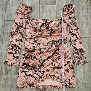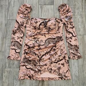 Stunning Odi Et Amo mini dress featuring a sweetheart neckline with built-in cups, dramatic puff sleeves, and a flattering bodycon silhouette. Crafted in luxe jacquard fabric with a blush pink cheetah print, this dress makes a bold statement while maintaining elegance. Perfect for parties, special occasions, or a night out. New with tags. Italian size 46, fits like a US size 10.