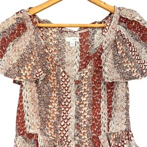 Odille Anthropologie Brown Feather Print Silk Flutter Sleeve Peplum Top Size 0