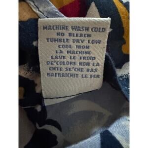 For sale is a vibrant Odille by Anthropologie blouse in size 6. Features a bold floral print with shades of navy, red, yellow, and cream on lightweight 100% rayon fabric. The blouse is designed with a ruffled neckline, adjustable keyhole tie at the front, short ruffle sleeves, and a loose comfy fit.