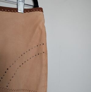 Amazing suede skirt with laser cut design. Lined. Probably from the early 2000s. Some dirt lines as shown in the photos - likely to come out when dry cleaned.