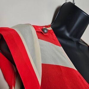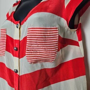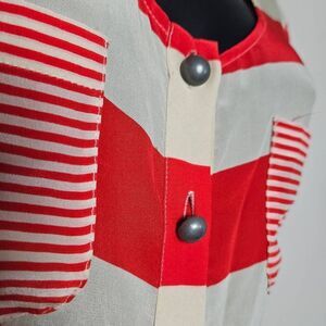 This is a silk button up blouse by Odille, an Anthropologie brand. It is red and cream and has pockets on each side of the chest. This blouse has additional button detailing on the shoulders.