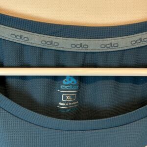 Gently Used Odlo Short Sleeve T-Shirt. This is a women's XL. Stone blue color throughout. Reflective Odlo logo and text on the front. Black stripes down the sides. Chill-tec fabric. Meshy and breathable, lightweight shirt. Care tag is gone, but I would assume a polyester blend. Would be great for hiking or running!