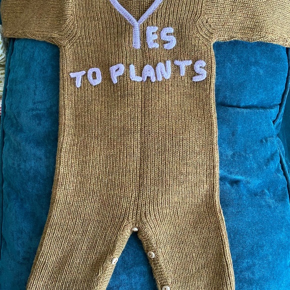 Charming brown knit footie by Oeuf. Features playful purple text Yes to plants. Soft and cozy for little ones. 100% alpaca