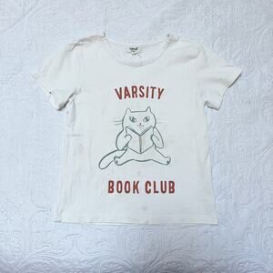 Oeuf organic cotton short sleeve graphic t-shirt. Varsity Book Club cat graphic design. Play condition for spots. Size 4.