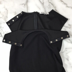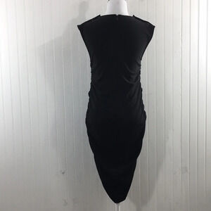 Of Mercer Black Bodycon Midi Dress Womens 2 Sleeveless Snap Shoulder Shirred Contemporary. Zip back closure. 94% Polyester, 6% Elastane. Pre-owned Condition- no flaws, no rips, stains, or holes.