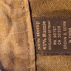 OD green, distressed. Drawstring with zipper, front pockets, back patch pockets XL