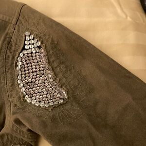 Of Two Minds woman’s green cargo pocket utility shirt jacket with sequin and beaded patches on