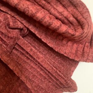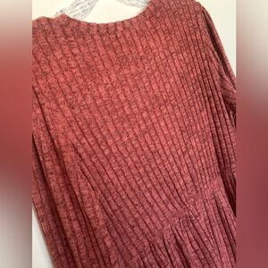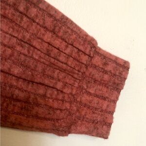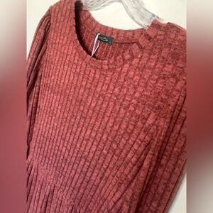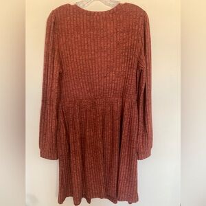 Pretty, cinnamon dress! Soft poly/rayon/spandex. Flattering vertically ribbed look! A great “reach-for” pick! About 17”L from shoulder seam to waist/38”L shoulder seam to hem/19” between underarms. NWT