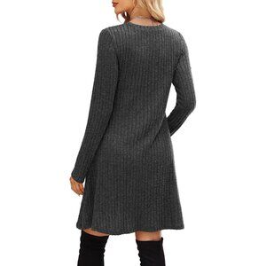 Ofeefan Women Grey Crew Neck Long Sleeve Empire Waist Dress with Pockets
