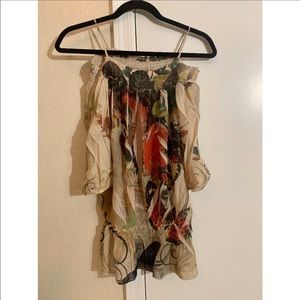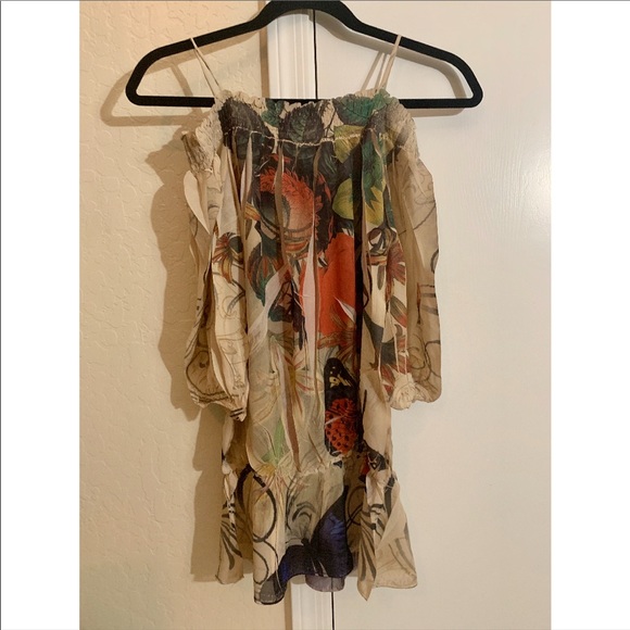Very cute off shoulder blouse leafy design. Very light fresh material is a size Large fits like a Medium but is not snug at all.