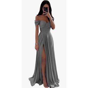 Off Shoulder Bridesmaid Prom Side Slit Satin Formal Evening with Pockets Dress