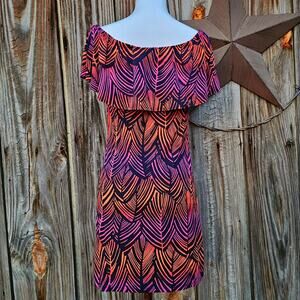 Off Shoulder Dress Trina Turk Merci Size S Navy Neon Orange Purple Print Ruffle