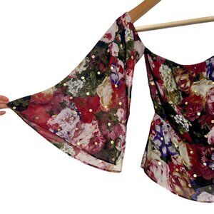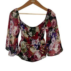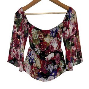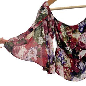 Sheer top layer over black lining. Off- shoulder with flare slit sleeves. No flaws!