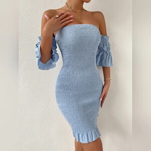 Off Shoulder Flounce Sleeve Shirred Ruffle Hem Bodycon Dress