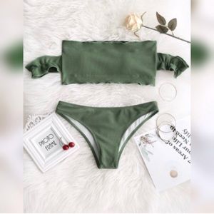 Sizes small & medium available! Brand new with tags & panty liner protection! Very sweet off shoulder bikini style in color army green! Full bottom coverage, Ribbed texture, elastic spandex stretch material, wire free & padded top! Bandeau style with attached ruffle off shoulder short sleeves! Fit true to size!