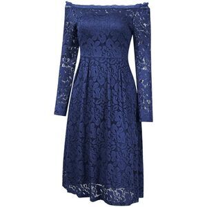 💙 Off Shoulder Lace Retro Pinup Vintage 1950s Long Sleeves Navy Dress L NWT