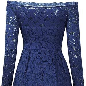 Bridesmaid Prom Off Shoulder Lace Romantic Retro Pinup Vintage 1950s Cocktail Party Long Sleeves Swing Navy Dress SIZE L NEW WITH TAGS