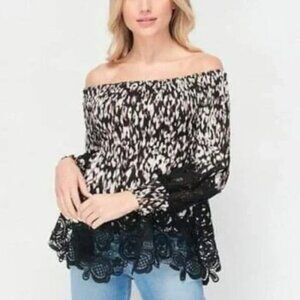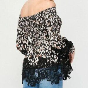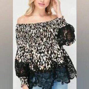 Smocked Off The Shoulder Lace Trim Top Leopard Print Black Brown