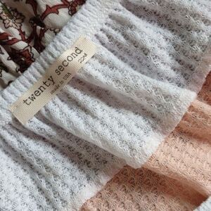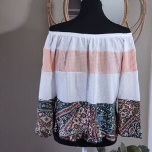 Off Shoulder Neutral Wide Striped Top with Pattern Bottom and Bell Sleeves Sz L