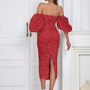 Off Shoulder Puff Sleeve Split Back Floral Jacquard Dress Red