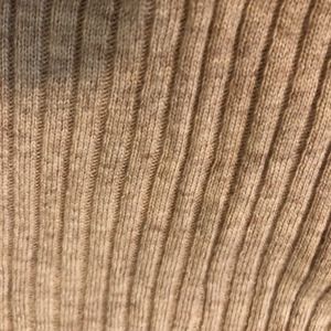 Tan off the shoulder ribbed sweater. The large "collar" can be brought high on shoulder or completely off shoulder.