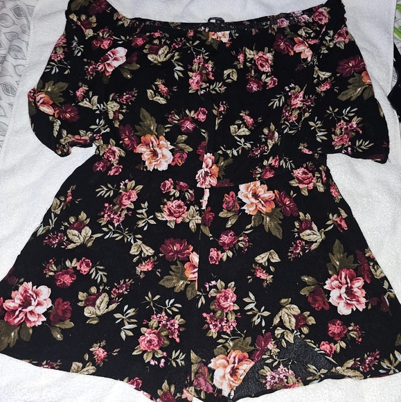 Floral, off shoulder shorts romper. Very lightweight and comfortable. Can be worn with or without bra.