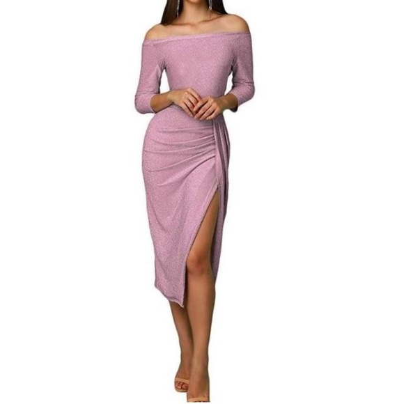 Off Shoulder Ruched Sexy Slit Dress Sz S Rose Pink