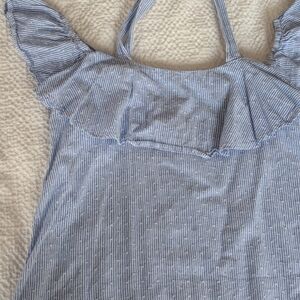 Blue and white, striped, ruffle, off the shoulder top, textured fabric.