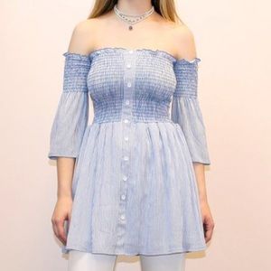 This top is smocked and super stretchy on the top. It is light blue and white striped with cute button detail down the front.