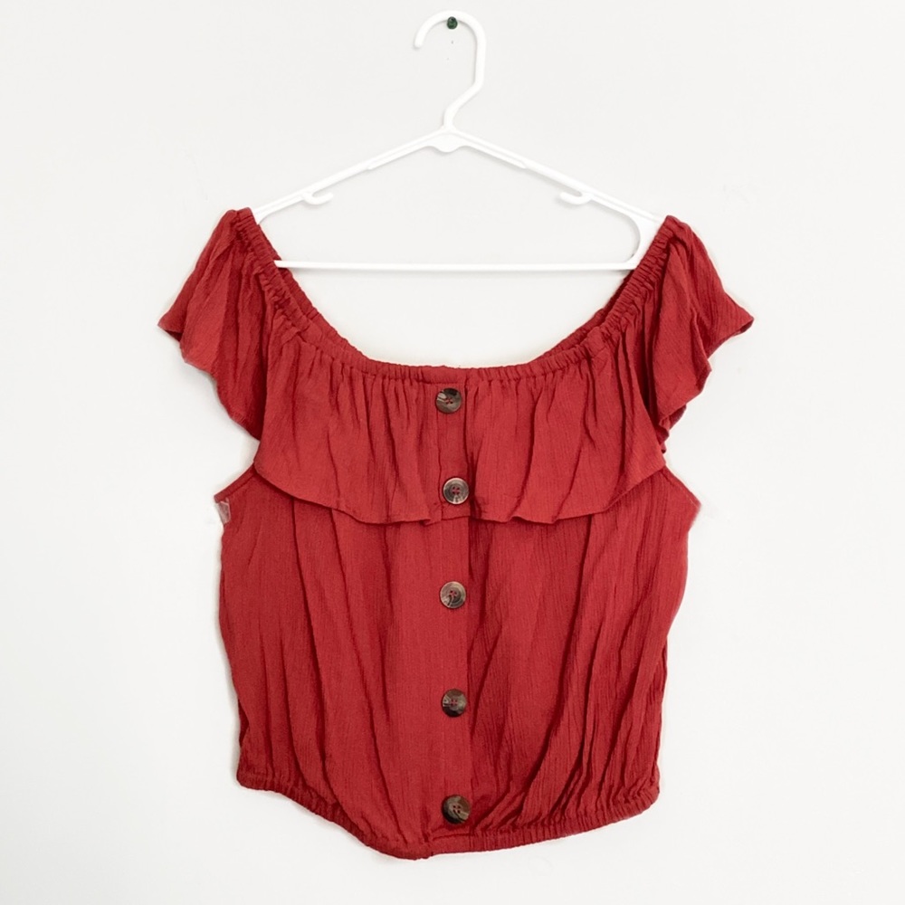 Terra cotta color off the shoulder ruffle top with decorative front buttons, and an elastic stretch hem and neckline. 100% Rayon.