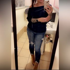 Like new off shoulder sweater-like top. Fitted around torso and looser up top. Very cute. As pictured, I paired with jeggings and boots. Smoke free home.