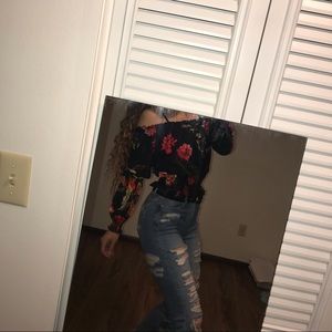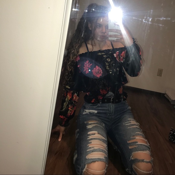 Super flattering off the shoulder top! Top has soft material and only has been worn once. You can always count on this top to look good for a go-to fit. Cinches your waist at the stomach area. Love this top & hope you will as well🌹🤍